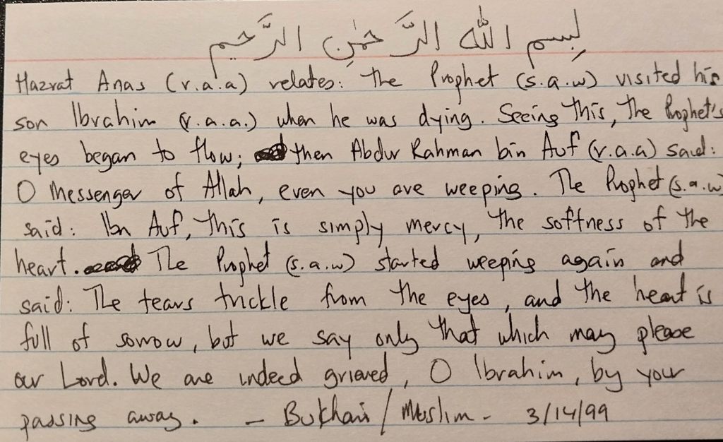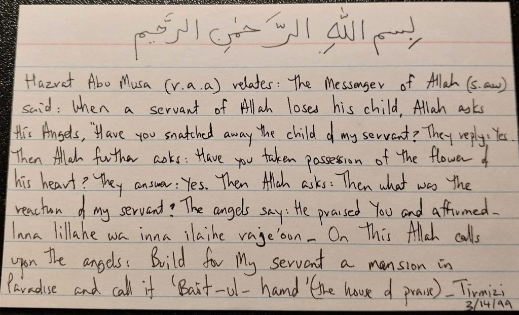 Adab? Hadn’t I remembered advice on etiquette on that dark, gloomy day? That Monday, the 8th of March, 1999. Gray clouds covered the horizon. After the funeral prayer in the spacious hospital room, we had followed the hearse to the cemetery. The rain had stopped briefly, just long enough for us to put her down in the grave. My husband’s body shook when he reached out for the little casket. Recalling lessons instilled by Dada-abba, my grand father, regarding the importance of good adab with God, I whispered to my husband, “Alhamdulillah hi ala kulle haal – praise be to God under all circumstances.”